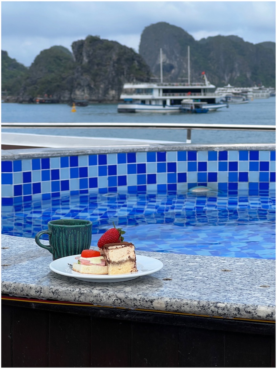 吃下午茶的时候游轮就离开天堂岛往回程方向开了,抵达码头时准准傍晚五点。我发现越南人的时间观念很好,各种行程说几点开始几点结束一般都很准确,非常棒。